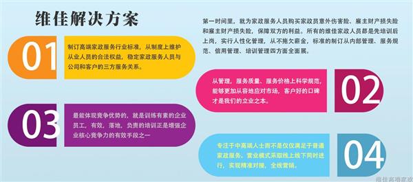 致力于制訂高端家政服務(wù)的行業(yè)標(biāo)準(zhǔn),家政市場才會(huì)更有序、更透明。從制度上維護(hù)了從業(yè)人員的合法權(quán)益,穩(wěn)定了家政服務(wù)人員與公司和客戶的三方服務(wù)關(guān)系。