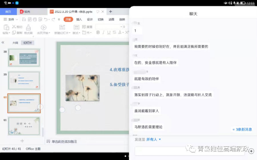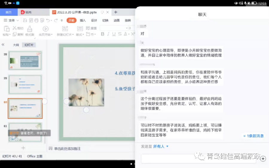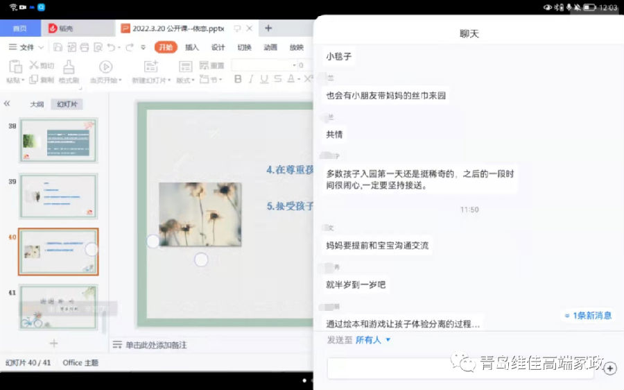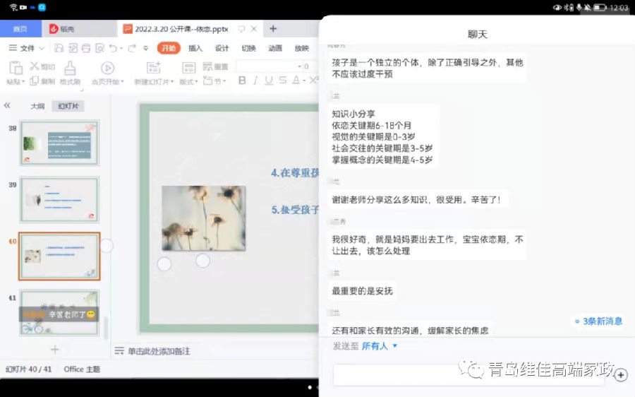 在課程最后我們就寶寶上幼兒園分離焦慮的現(xiàn)象以及小月齡寶寶與依戀對象分離的應(yīng)對措施做了分析,找出來一些解決辦法。大家都很棒,各抒己見,很多想法和建議都很有建設(shè)性,更有專業(yè)的幼兒園園長和幼兒教師給大家支招。